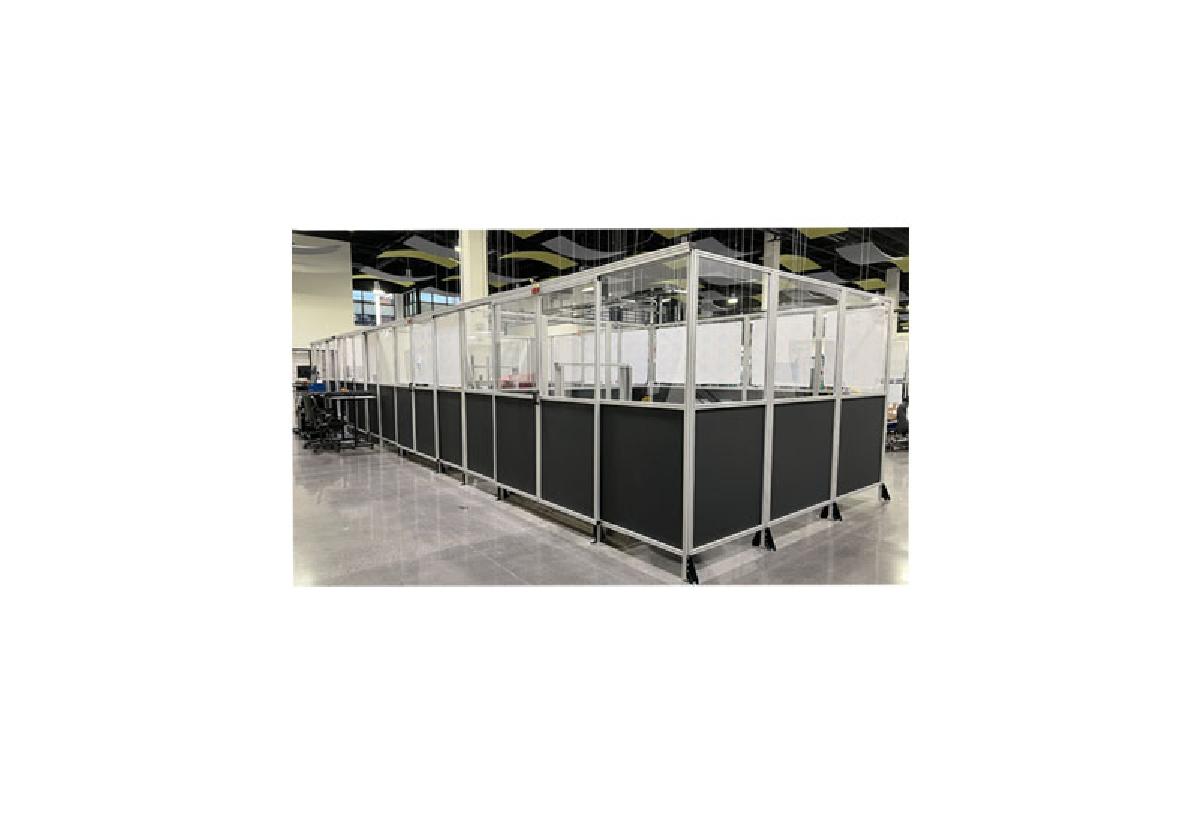 This partition guarding solution was preassembled at our facility and delivered to the customer with comprehensive installation instructions. It features multiple large double-door assemblies equipped with non-contact safety switches. The guard panels were constructed using a combination of polycarbonate and ABS materials, ensuring both durability and visibility. The entire structure was securely anchored to the shop floor using floor-mounted fasteners.