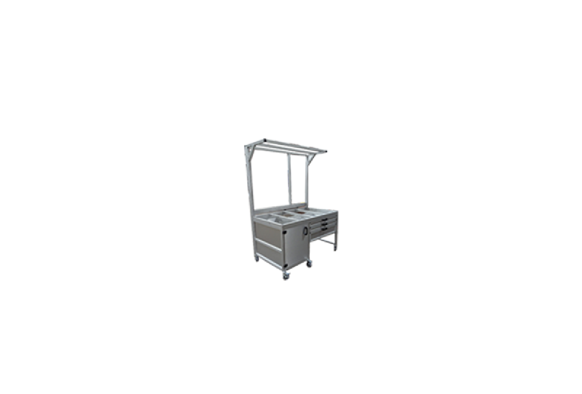 This is a complete workstation system for assembling manifolds. This uses multiple extrusion drawers for storing equipment and tools. There is a larger compartment that houses a computer system to display the jobs information to the operator.